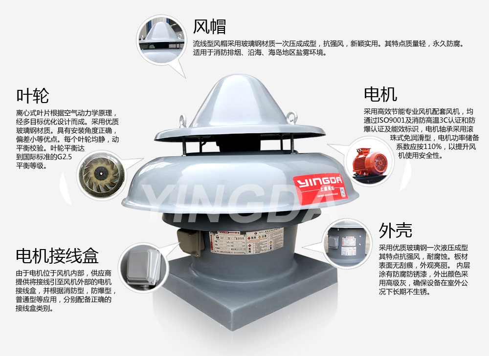 1.1.DWT-II型玻璃鋼離心式屋頂風(fēng)機,其葉輪采用離心式葉輪,可適用風(fēng)量小而壓力較高的場所;采用單層風(fēng)帽。