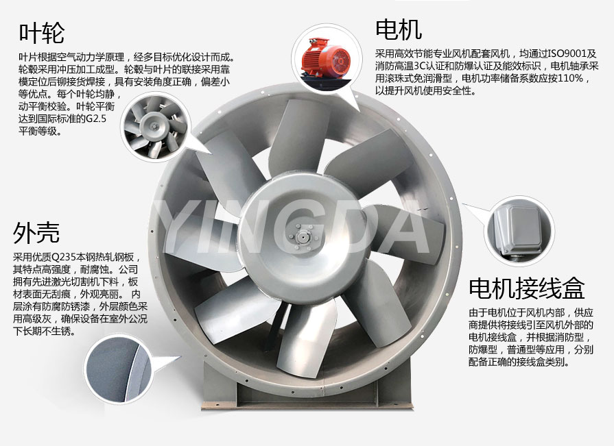 英達(dá)風(fēng)機(jī)采用生產(chǎn)電機(jī)生產(chǎn)設(shè)備和檢查手續(xù)齊全的風(fēng)機(jī)專用配套電機(jī),均通過ISO9001及消防高溫3C認(rèn)證和防爆認(rèn)證及能效標(biāo)識。電機(jī)應(yīng)與風(fēng)機(jī)負(fù)載緊密配合,采用B3安裝結(jié)構(gòu)。電機(jī)防護(hù)等級為IP54,絕緣等級F級,溫升等級B級。電機(jī)軸承應(yīng)為滾珠式免潤滑型。電機(jī)功率儲備系數(shù)應(yīng)按110%取,以提升風(fēng)機(jī)使用的安全性。